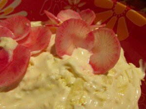 Перед подачей на стол салат хорошо бы украсить. Если есть дайкон или редис, можно сделать красивые маки, воспользовавшись идеей для украшения салата. Вначале вставляем в салат подкрашенные свеклой лепестки из тонких кружков дайкона в форме цветка.