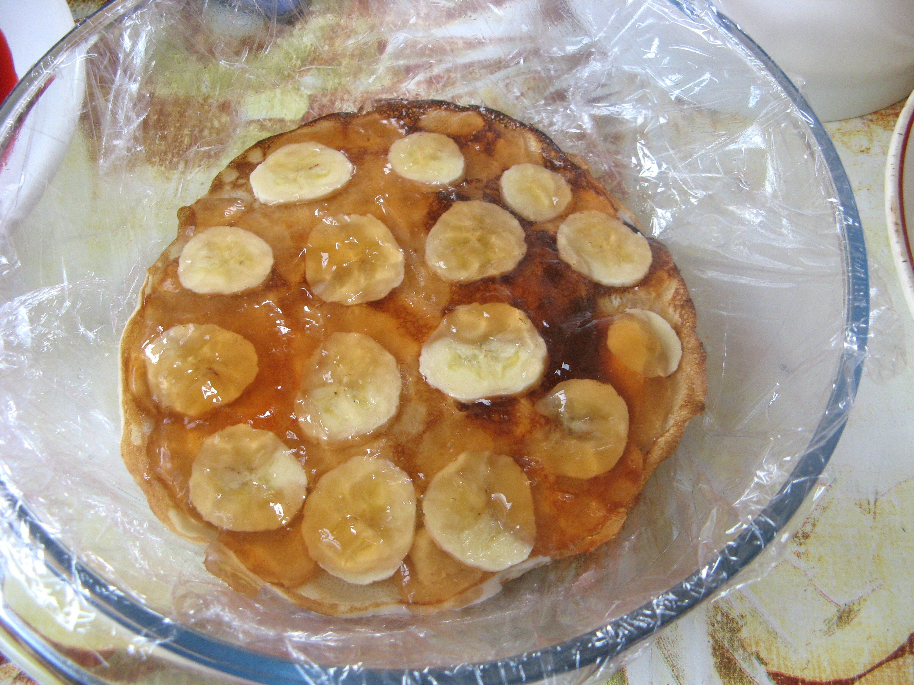 Затем накрываем следующим блином, выкладываем кружочки бананов и облепиховое желе.