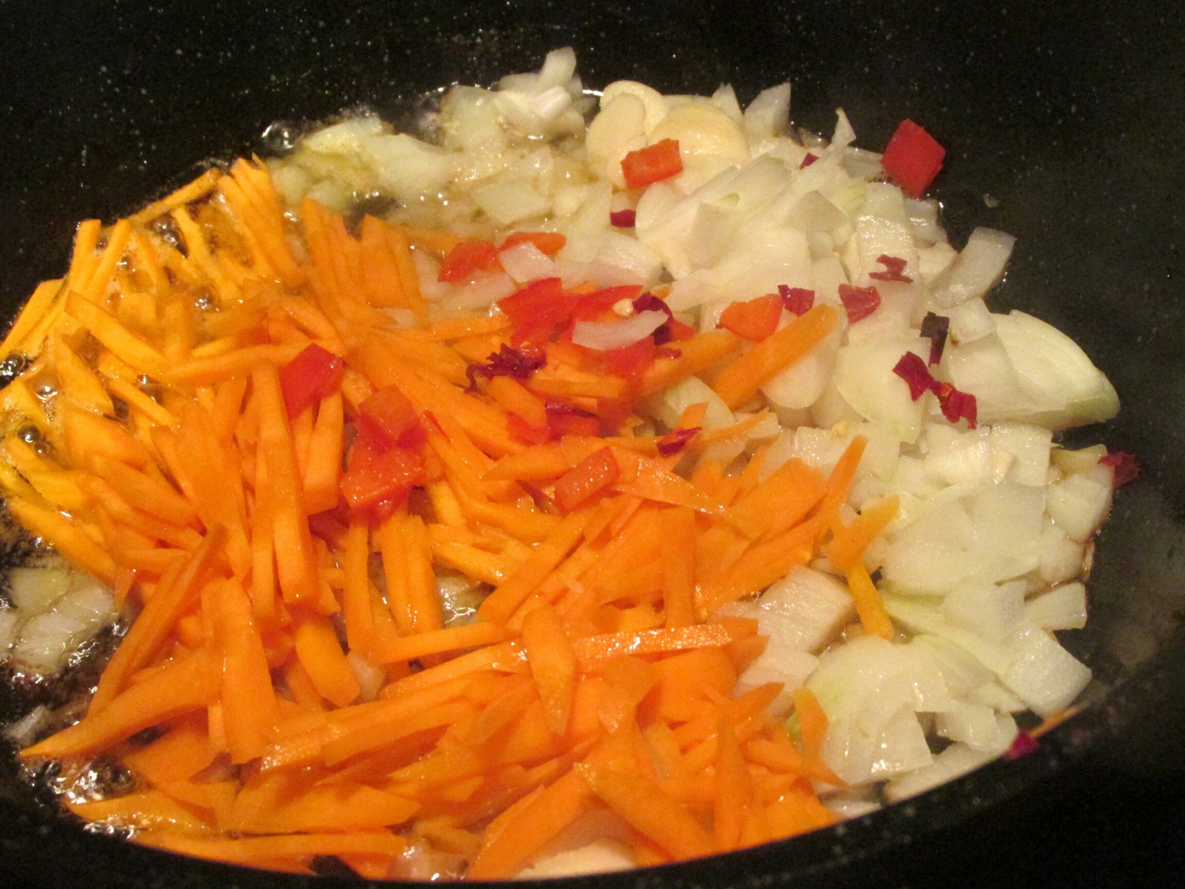 Обжаренное мясо переложить на тарелку, а в сотейник выложить подготовленные овощи: лук, морковь, перец чили, чеснок и обжарить их минут пять.