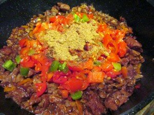 Продолжаем тушить на среднем огне 45 минут. После этого добавляем помидоры, все специи и готовим минут пятнадцать.