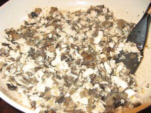 Когда грибы немного обжарятся, добавляем куриное филе. Готовую обжаренную начинку необходимо остудить.