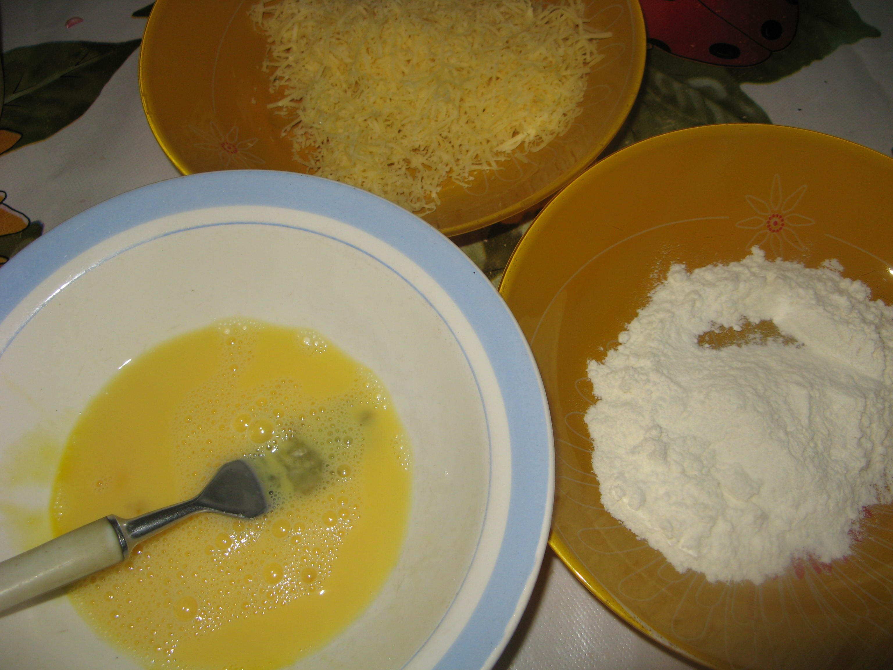 Вначале куриный стейк обмакнуть во взбитое яйцо, потом в сыр и в муку.