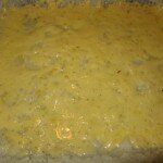 Противень, смазанный маслом, обсыпаем панировочными сухарями, выкладываем рис, сформировав бортики, посыпаем сыром и отправляем в разогретую духовку.