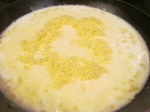 Приготовим соус. Вначале на топленом масле обжарим измельченные лук и чеснок, добавим муку, тщательно перемешаем. Затем необходимо влить молоко и бульон, вновь перемешиваем и добавляем половину натертого сыра.