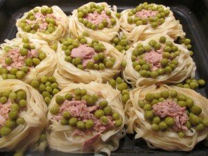 Каждое макаронное гнездышко наполняем кусочками консервированного тунца, выкладываем зеленый горошек