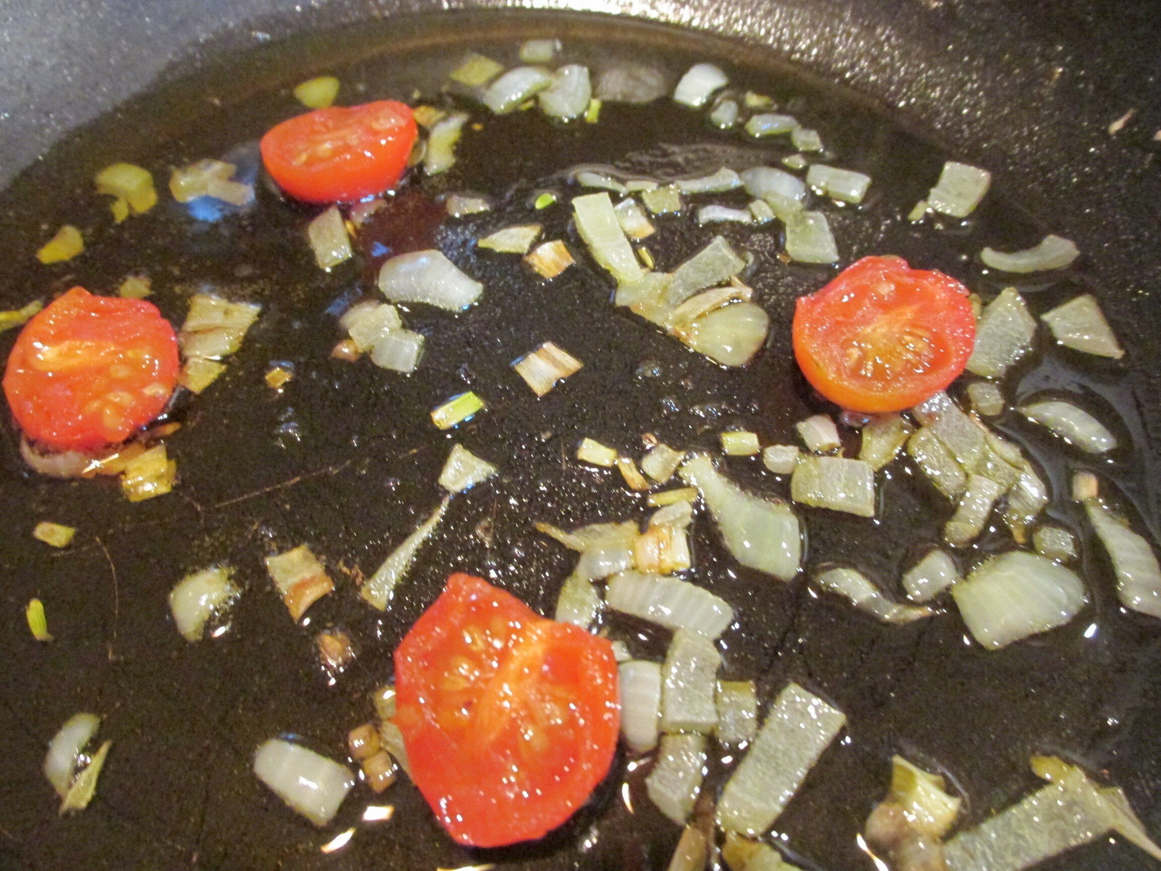 Вначале на растительном масле обжариваем лук, затем выкладываем половинки помидоров.