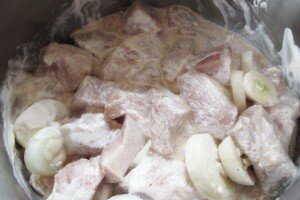 Мясо индейки помыть и порезать средними кусочками. Лук репчатый очистить и порезать кольцами.
