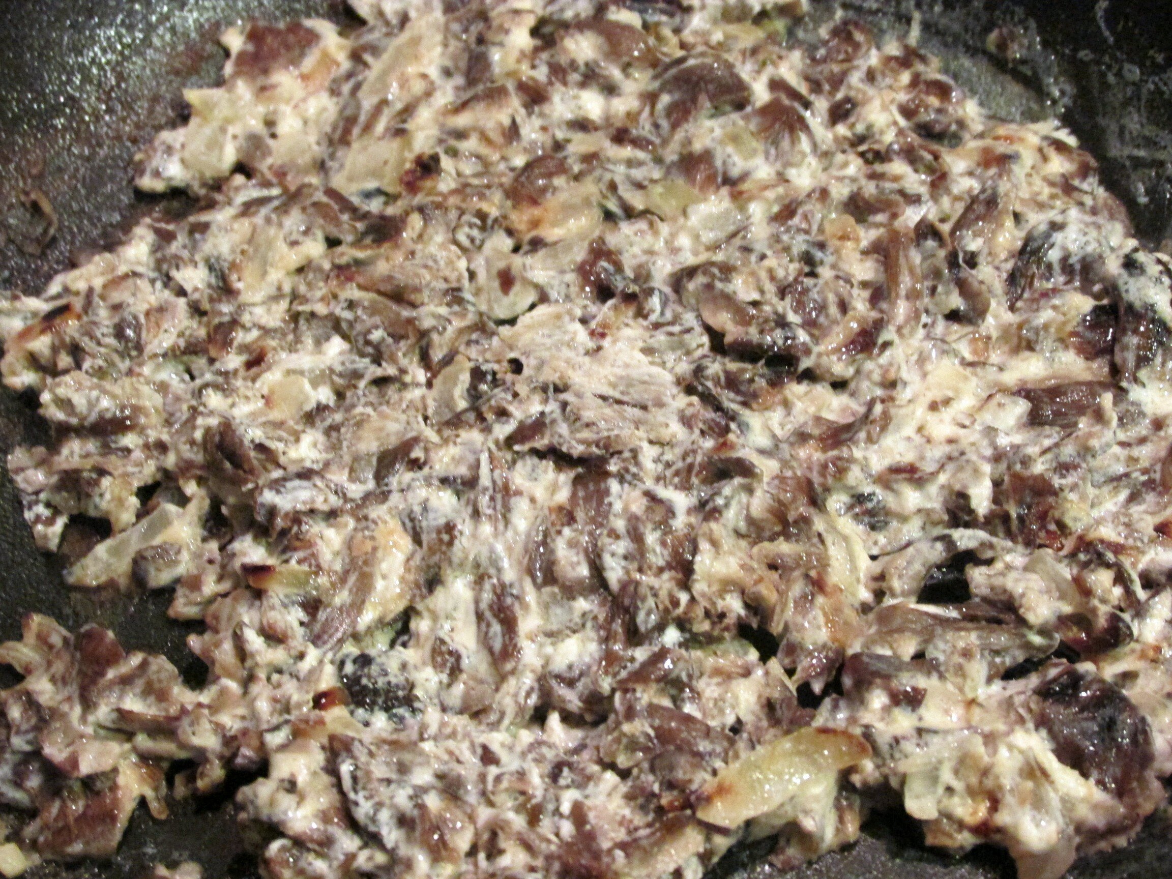 Грибы режем небольшими кусочками и обжариваем вместе с измельченным репчатым луком на топленом масле.