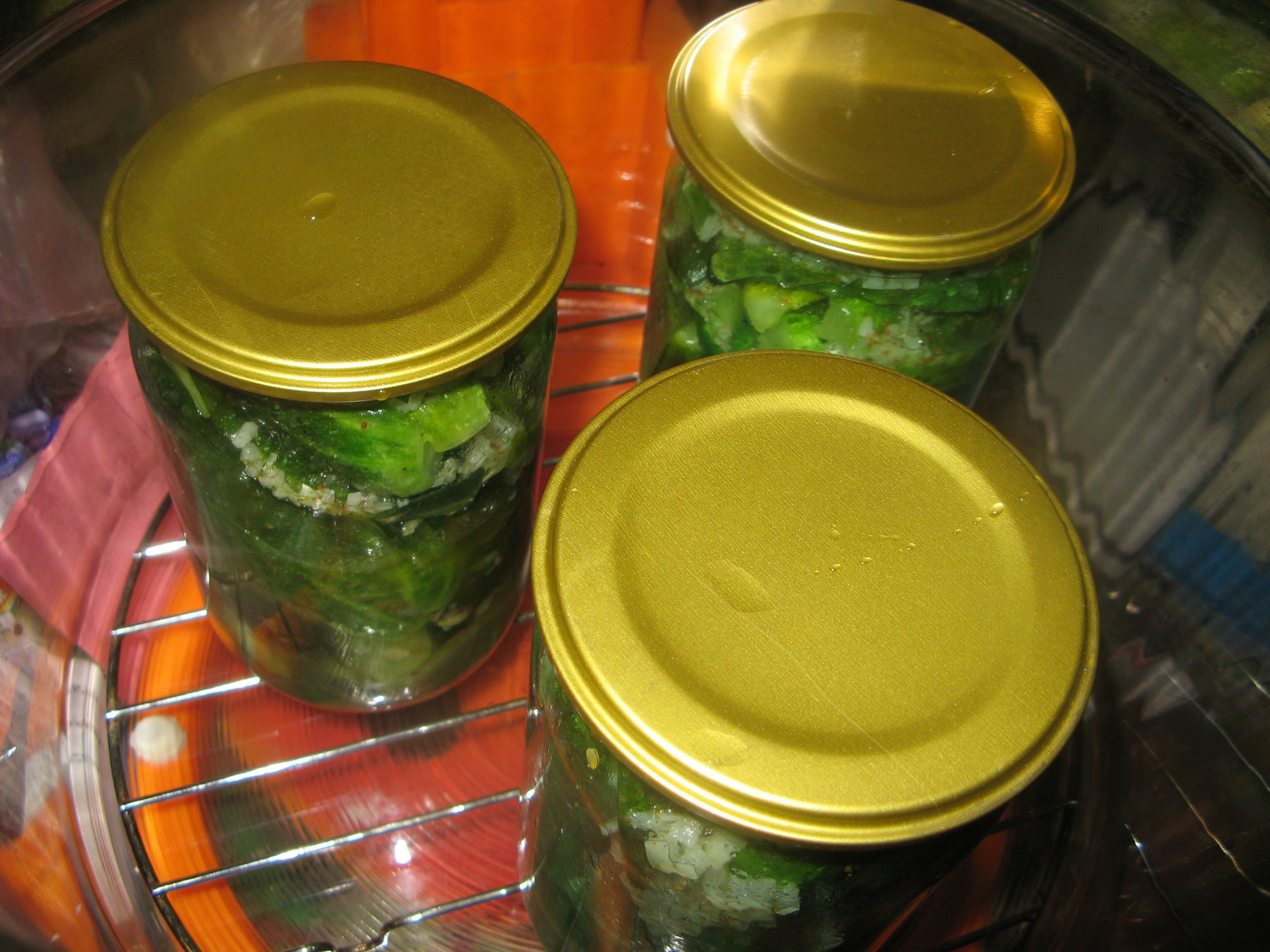 В подготовленные банки (750 гр.) выкладываем огурцы вместе с маринадом, стерилизуем 15-20 минут, закатываем и укутываем банки до полного остывания. Очень удобно стерилизовать консервы в аэрогриле.